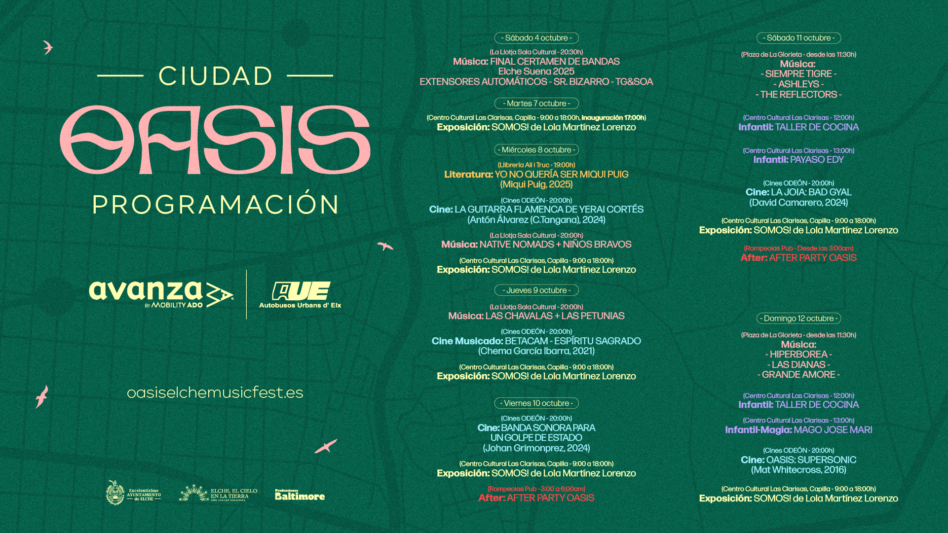 Ciudad Oasis propone una agenda diversa y abierta a todos los públicos con conciertos, cine, literatura, actividades infantiles, talleres y exposiciones, que transformarán la ciudad en un gran escenario cultural entre el 4 y el 12 de octubre, gracias al impulso de Avanza Autobuses Urbanos de Elche.