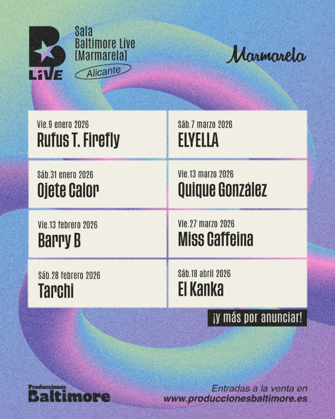 Con esta programación, Producciones Baltimore refuerza su compromiso con la cultura y la música en vivo, acercando a Alicante una oferta de conciertos única y consolidando la Sala Marmarela, con capacidad para 2.000 personas, como uno de los grandes escenarios musicales de la ciudad.